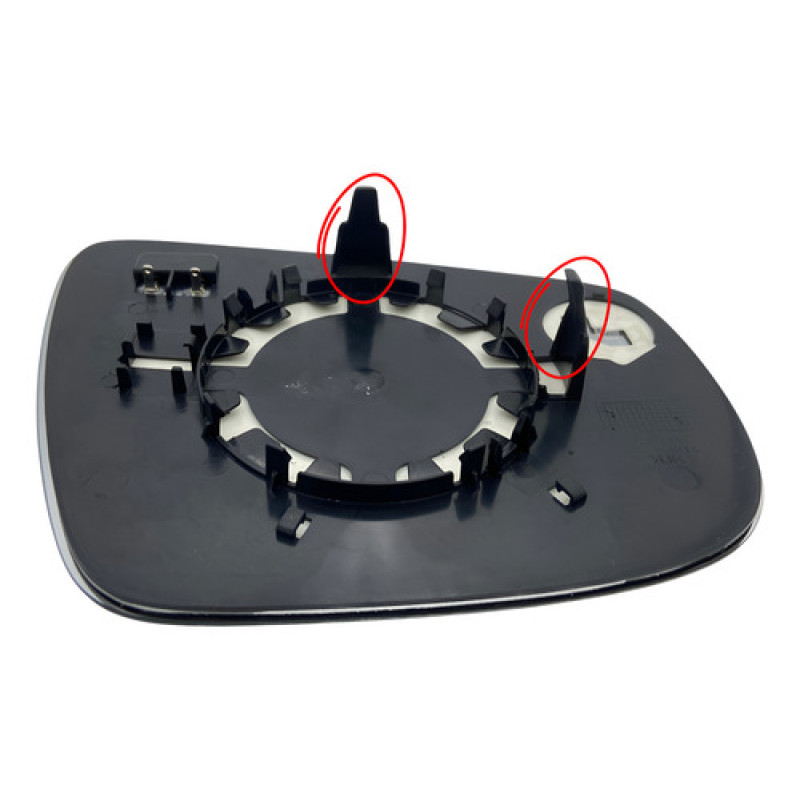 • Para confirmar se este é o modelo do seu retrovisor, em comparação a outras lentes retrovisoras da Chery, é possível verificar que a base plástica tem duas ponteiras plásticas (marcadas na penúltima foto em vermelho);